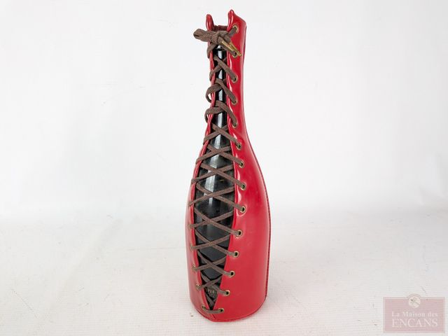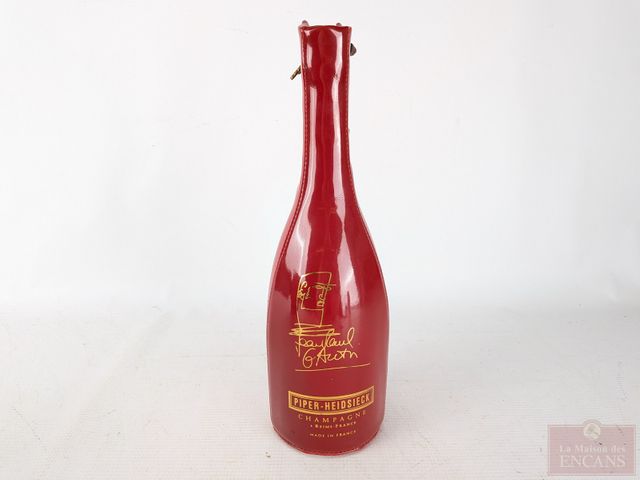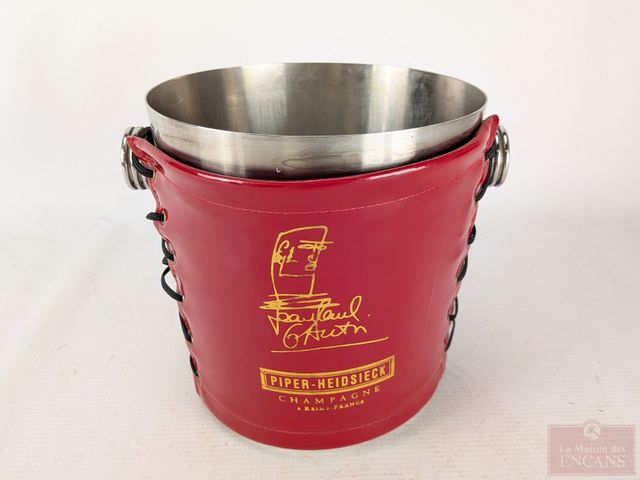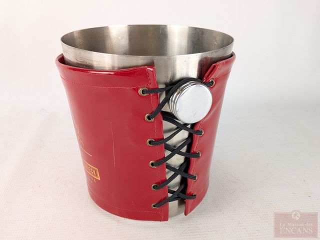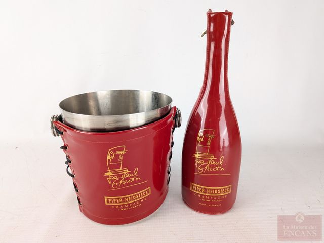 Lot # 101 - Seau à champage et étui à bouteille Piper-Heidsieck en métal et cuir, fait en France et mesurant 7 pouces de hauteur