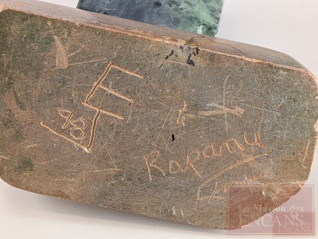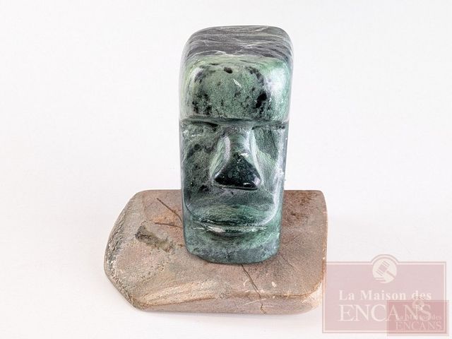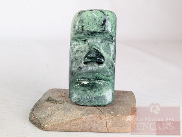 Sculpture sur serpentine signée représentant une statue de l'ile de Paques, mesurant 3.5 pouces de hauteur et titrée Rapanu