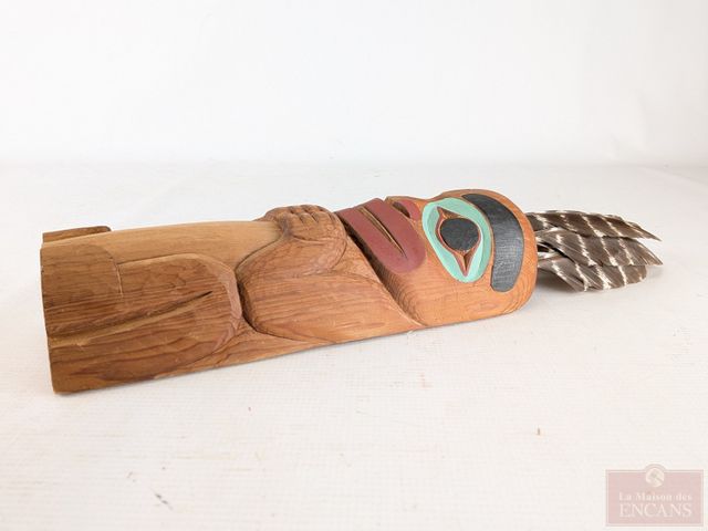 George PEUNIER- Sculpture haïda sculptée et peinte à la main sur bois, mesurant 17 pouces de hauteur avec plumes