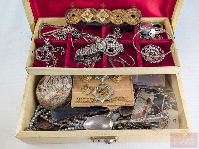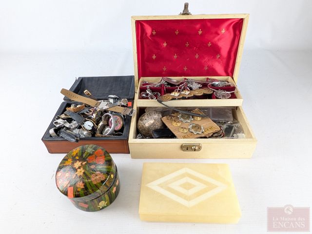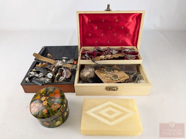 Gros lot de montres et de bijoux de fantaisie avec coffres à bijoux, le plus grand mesurant 11x8 pouces