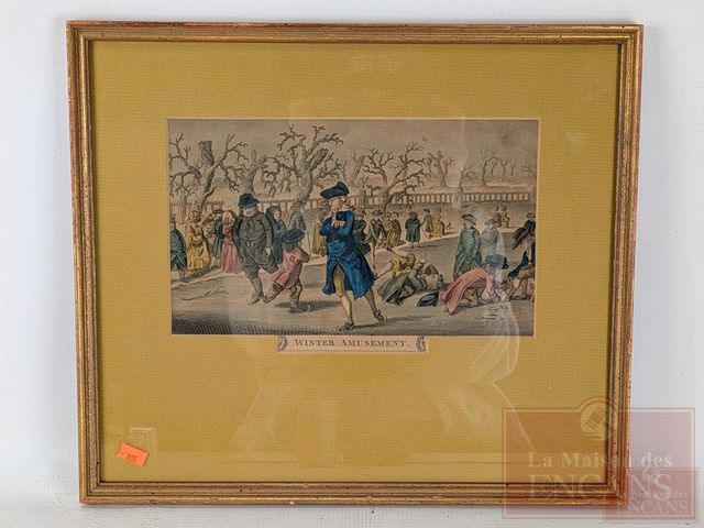 Lot # 190 - Ancienne gravure aquarellée à la main, circa 1880, mesurant 6x10 pouces et titrée Winter Amusement
