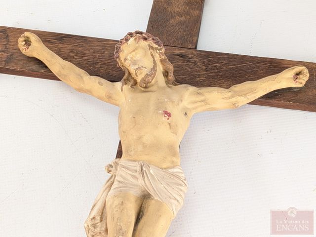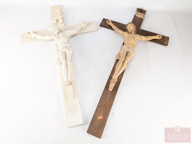 Lot # 9 - Deux anciens crucifix en plâtre et bois, peints à la main, mesurant 32 pouces de hauteur chacun