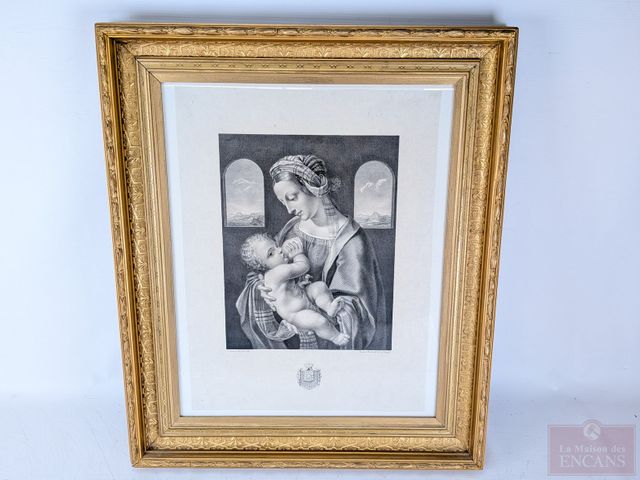 Lot # 68 - Jacopo BERNARDI - Eau forte mesurant 13x10 pouces représentant la Vierge à l'enfant de Léonard de Vinci dans un joli encadrement