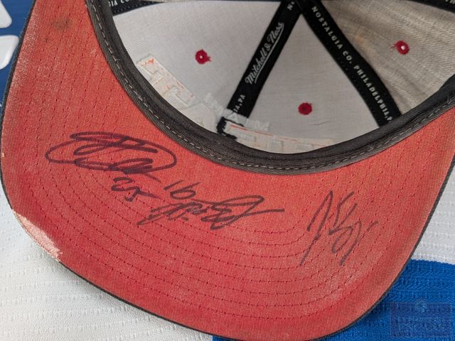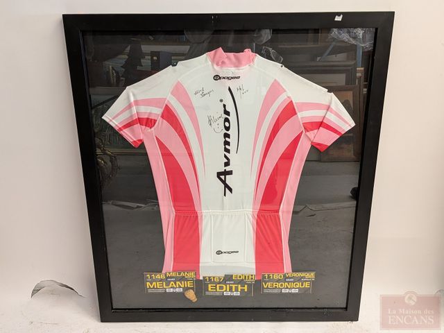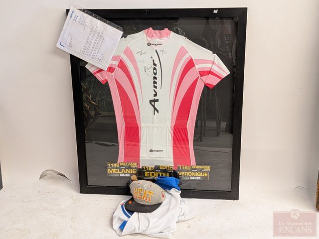 Lot # 1 - Lot d'autographes comprenant chandail de hockey TVA Sport, casquette Miami Heat et gilet de cycliste dans un encadrement mesurant 39x34 pouces