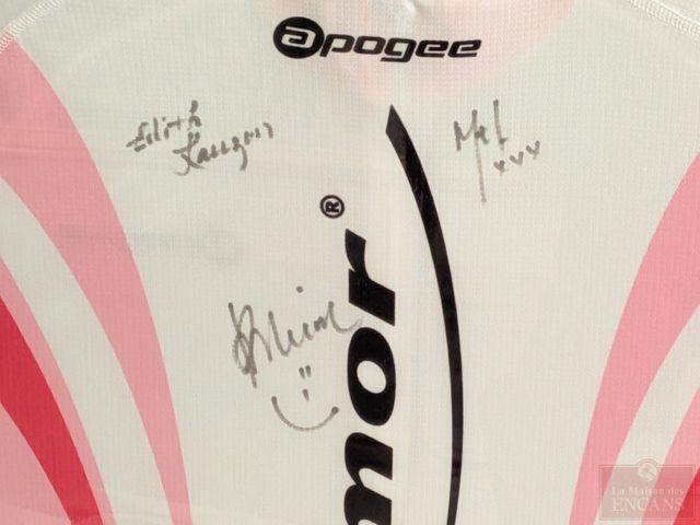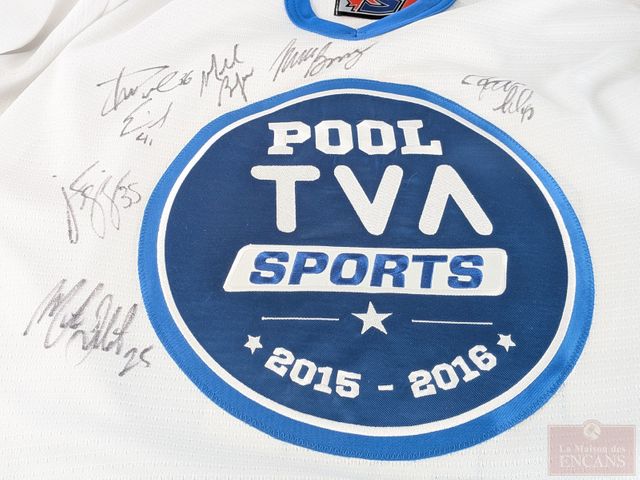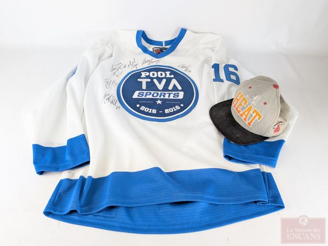 Lot d'autographes comprenant chandail de hockey TVA Sport, casquette Miami Heat et gilet de cycliste dans un encadrement mesurant 39x34 pouces