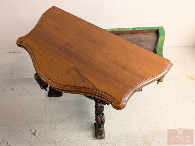 Lot # 4 - Superbe table de cartes anglaise sculptée sur bois, datant du 19eme siècle, rabattable et mesurant 30x34x36 pouces lorsque déployée