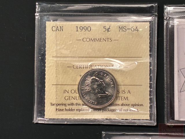 Lot # 157 - 3 Pièces : (5 Cents 1990 MS-64) + (5 Cents 2000P MS-64) + (25 Cents 1965 MS-63) certifiées ICCS et CMG