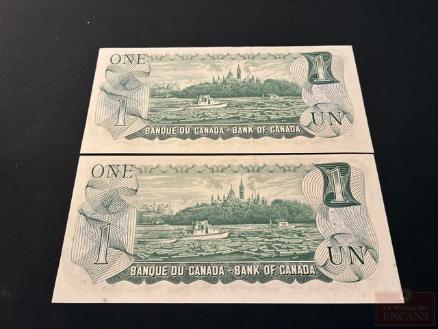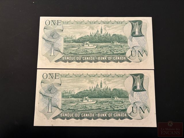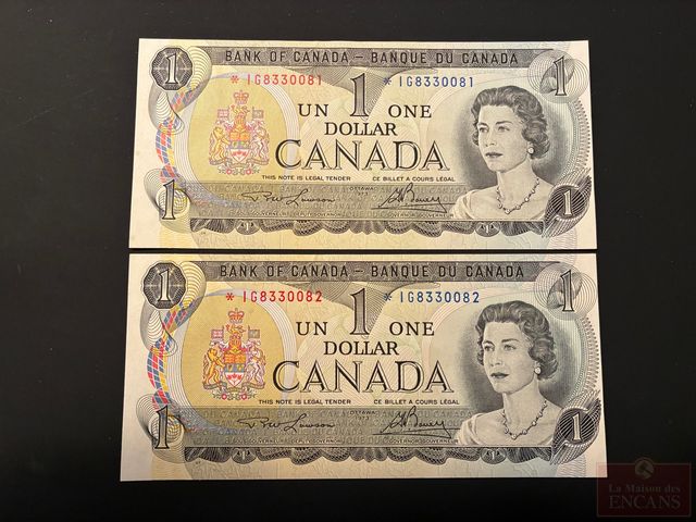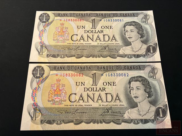 Lot # 82 - 2 Billets de $1 1973 avec astérisque ‘num. de remplacement IG’ incirculés avec num. consécutifs et erreur de coupe (rare)