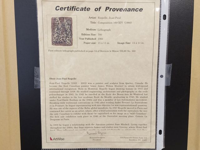 Lot # 34 - Lithographie originale de Riopelle éditée par la Galerie Maegth sur les presses de Mourlot à Paris - 1966 - 12.5x9.25 pouces - avec document à l'endos   SOLD
