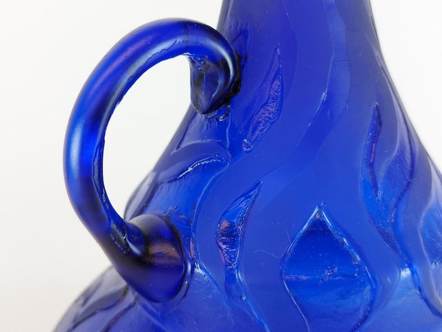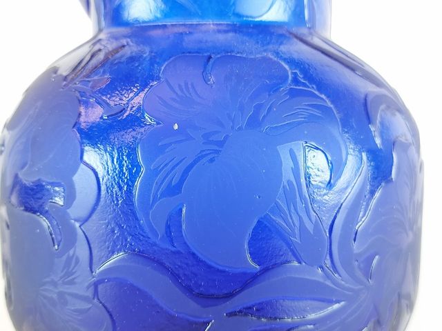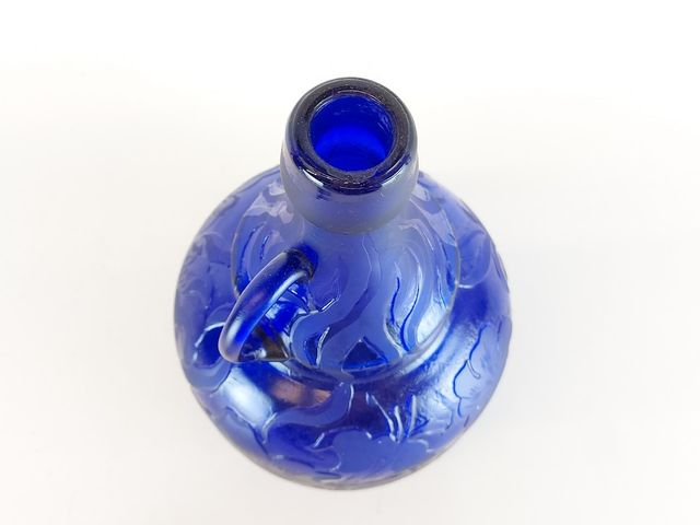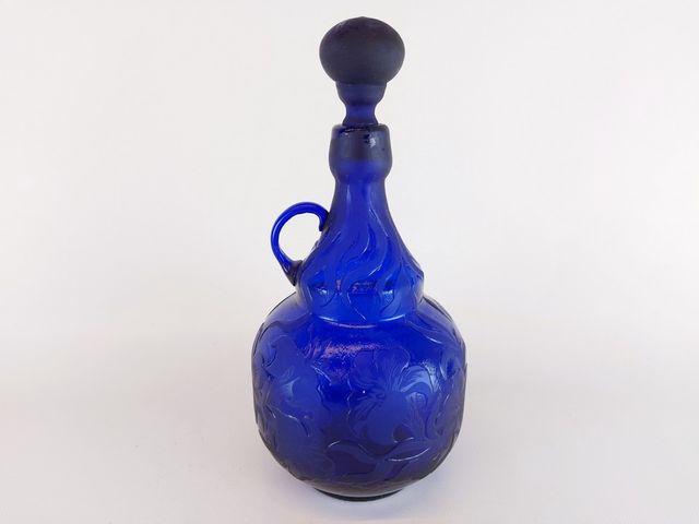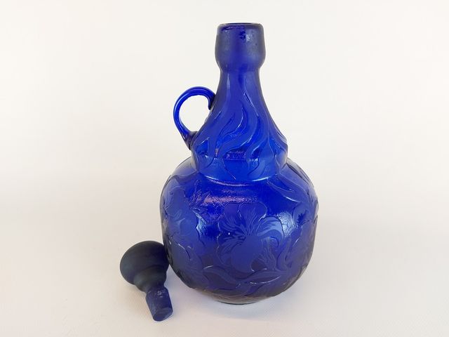 Superbe carafe Risard Ramski en verre bleu cobalt de Pologne - artiste exposé dans de nombreux musées européens - jolies motifs floraux - avec son bouchon - 12.25 pouces de hauteur