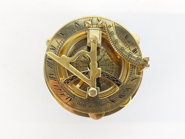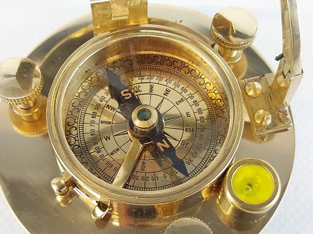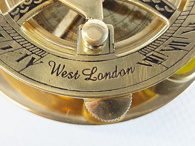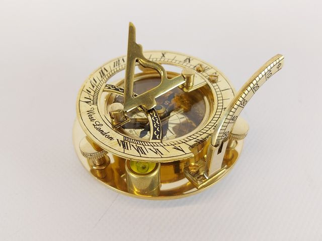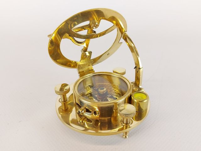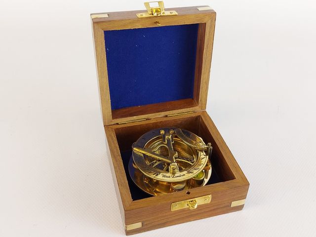 Lot # 142 - Joli compas de navigation avec boussole maritime et cadran solaire - tout en laiton - 2.75 pouces de diamètre - avec visses de mise à niveau et mécanisme de verrouillage - dans son coffret de rangement d'origine en bois de rose ornée d'une ancre de bateau en laiton  SOLD