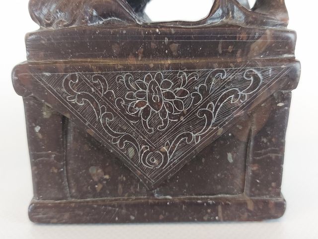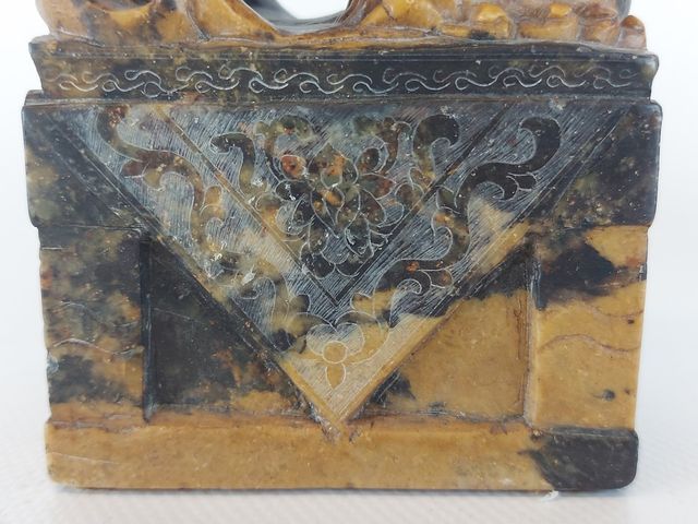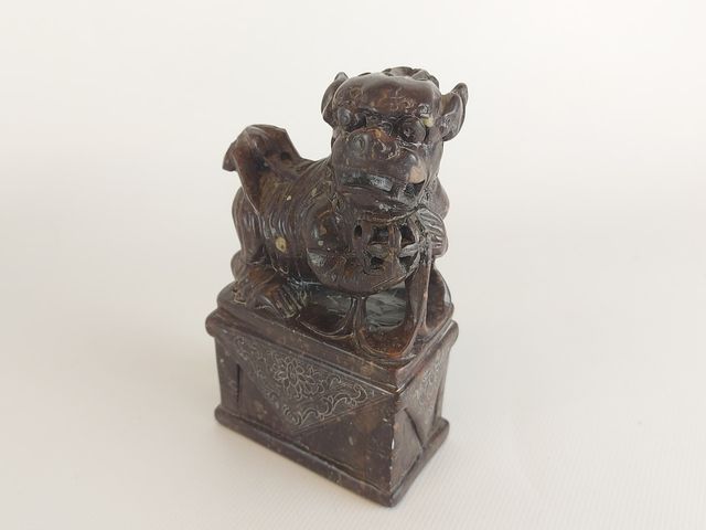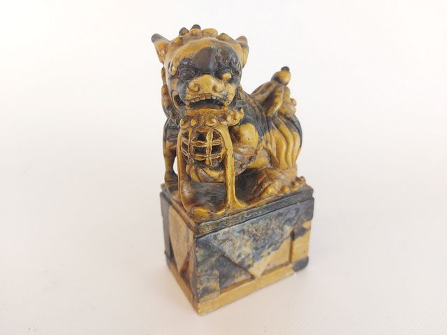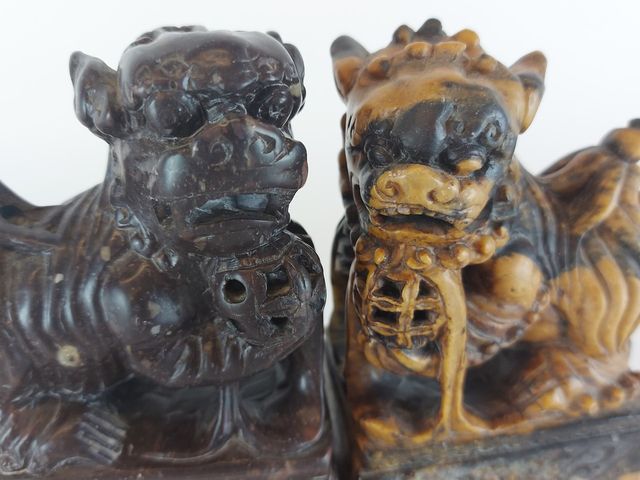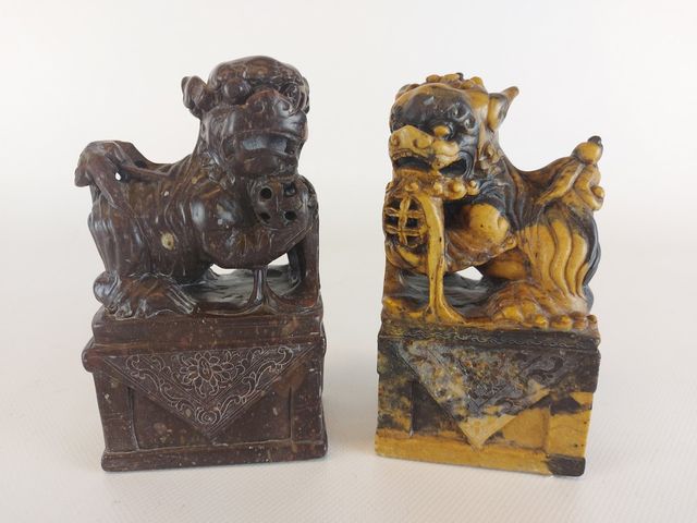 Superbe paire de Foo Dog sculptés sur une pierre avec de jolies tonalités de couleur - 5.75 pouces de hauteur