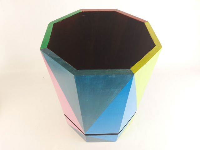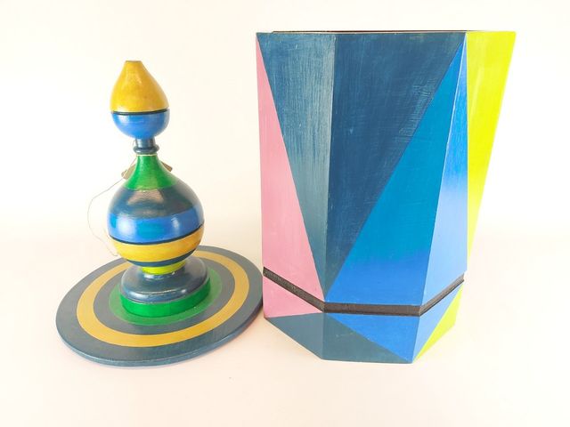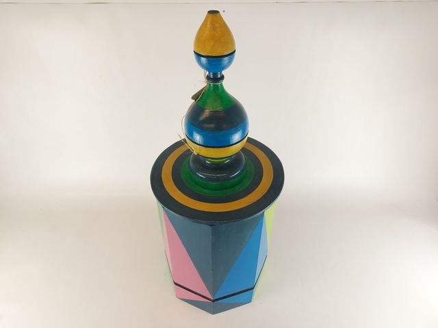 Lot # 101 - Cache pot en bois peint à la main - art populaire - avec couvercle pour servir de contenant - signé Iraklis - hauteur totale 35 pouces SOLD