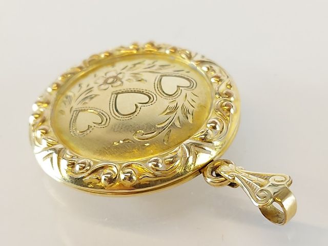 Lot # 190 - Joli loquet en or 14k finement ciselé de motif de coeur et de fleurs - contient une photographie ancienne - 1 pouce de diamètre  SOLD