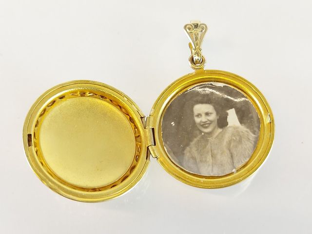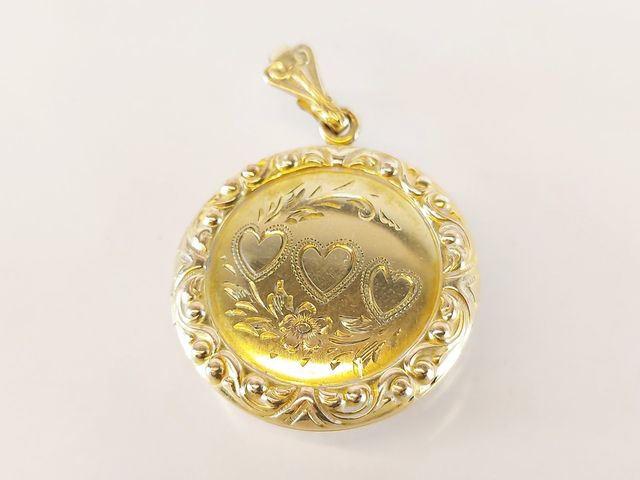 Joli loquet en or 14k finement ciselé de motif de coeur et de fleurs - contient une photographie ancienne - 1 pouce de diamètre