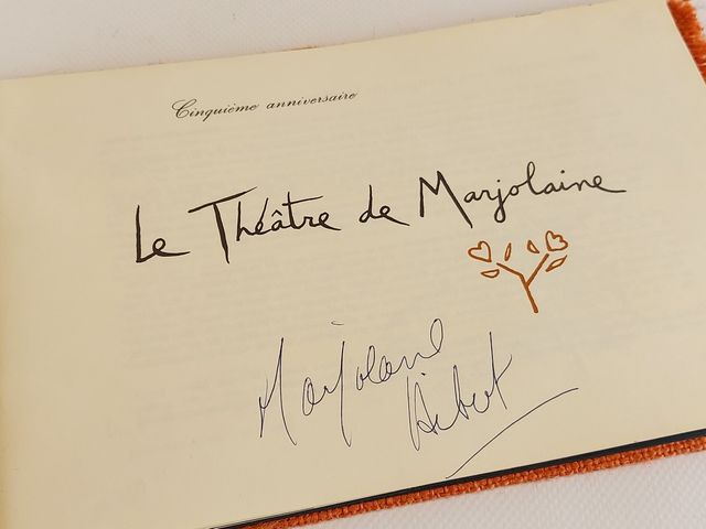 Lot # 141 - Programme du cinquième anniversaire du Théatre de Marjolaine signée par sa fondatrice Marjolaine Hébert - années 60 - relié comme un livre d'art - 6x9.5 pouces  SOLD