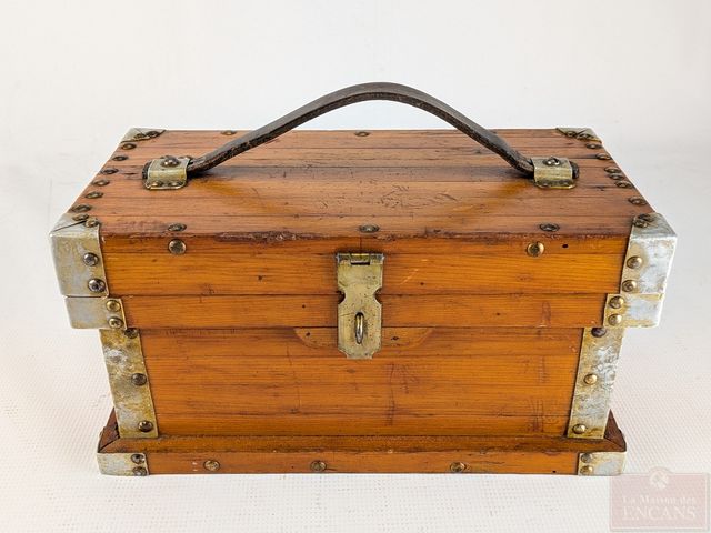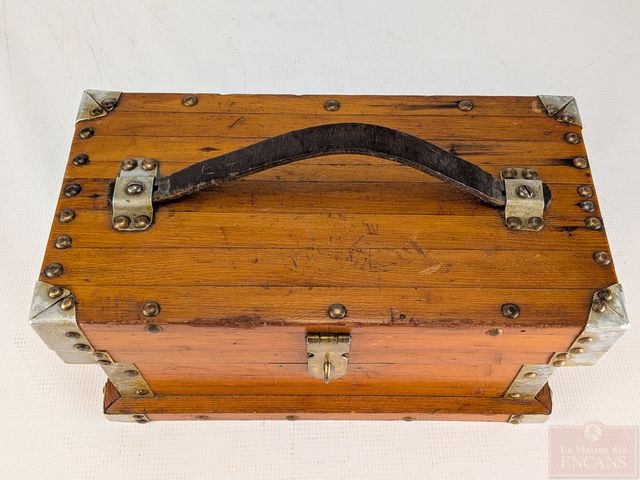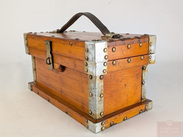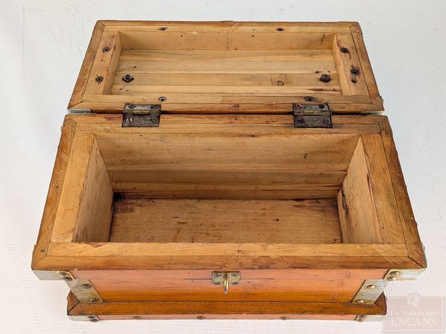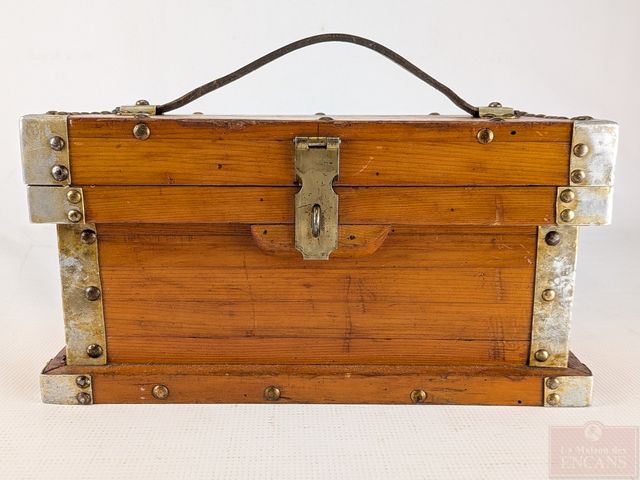 Lot # 54 - Coffre art-populaire en bois de pin et métal, circa 1960, mesurant 13 pouces de largeur