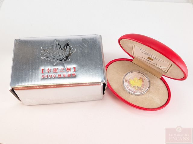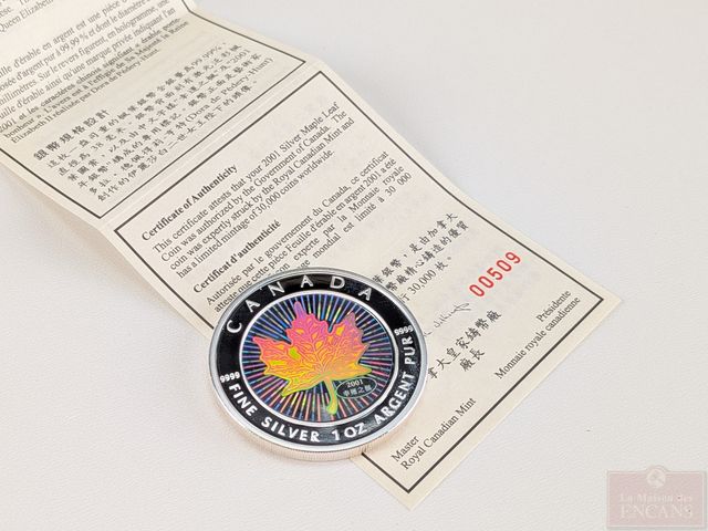 Lot # 94 - Pièce d'une once d'argent pur 9999 Canada 2001 Feuille d'érable holographique, encapsulée, dans sa boite d'origine avec coffret et certificat, sans taxes