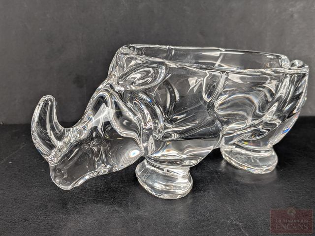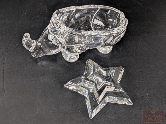 Deux centres de table en cristal, dont un Baccarat représentant une étoile et un de la verrerie française Cofrac, représentant un rhinocéros et mesurant 7 pouces