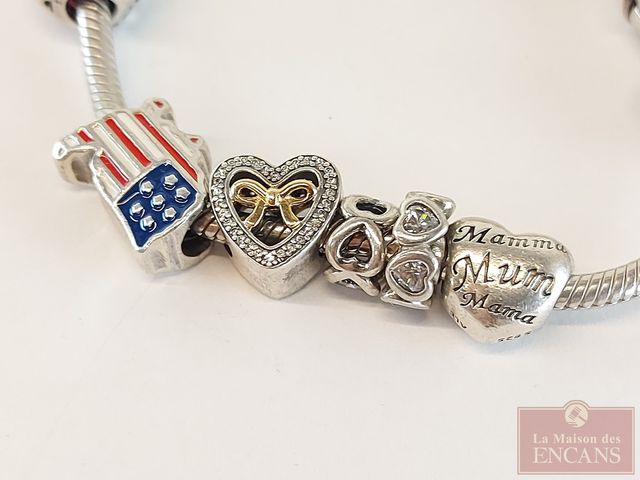 Lot # 187 - Bracelet Pandora en argent avec plusieurs médaillons et mesurant 3 pouces SOLD
