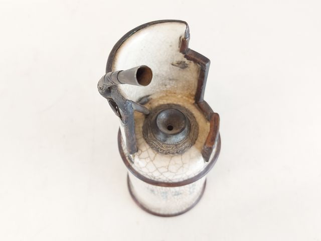Ancienne pipe à opium chinoise en porcelaine et en métal - peinte à la main - signée en-dessous - mesurant 9.5 pouces de hauteur
