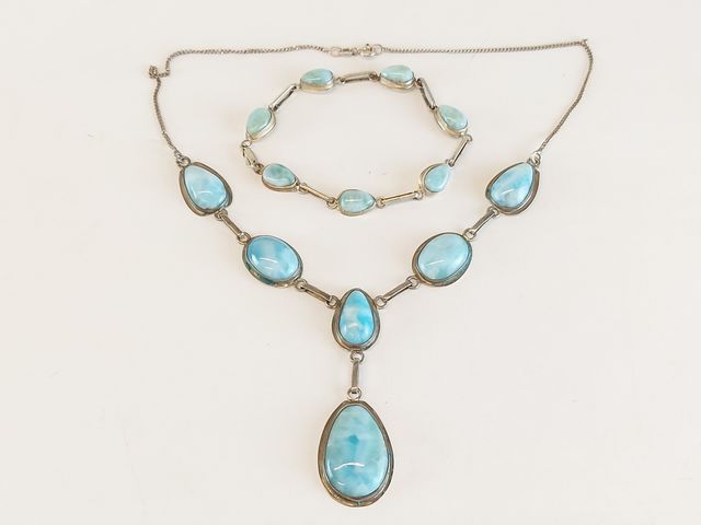 Lot # 114 - Bracelet et collier en argent serties de multiples larimars - le collier mesurant 16 pouces de largeur et le bracelet mesurant 6 pouces de largeur SOLD