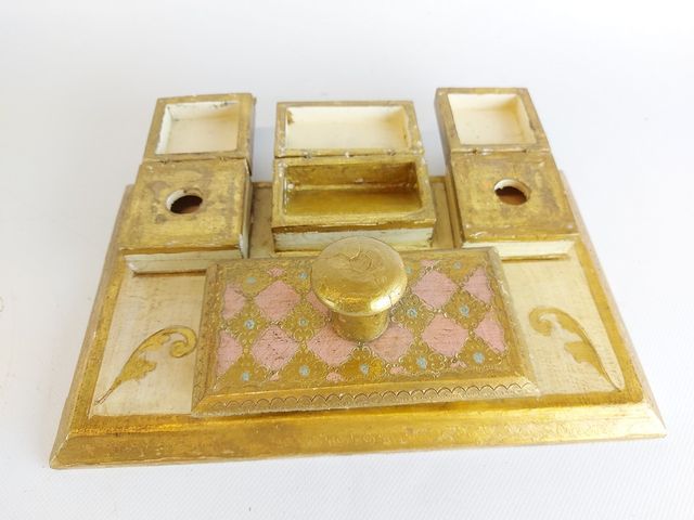 Ensemble d'objets vénitiens pour le bureau en bois doré à la feuille d'or - la corbeille mesurant 13.5 pouces de hauteur