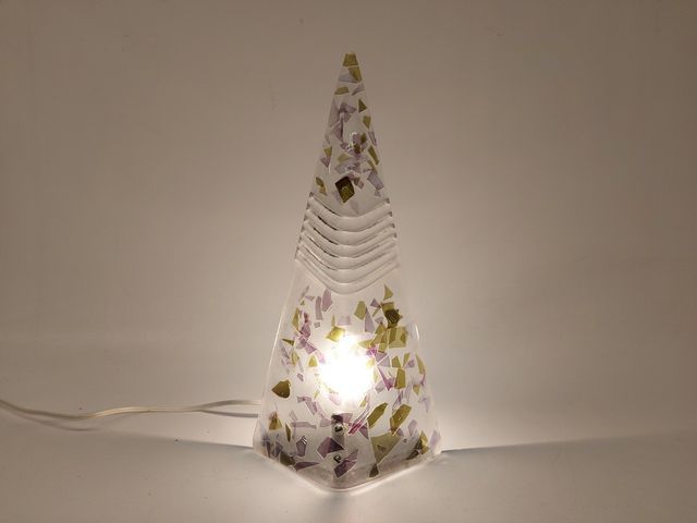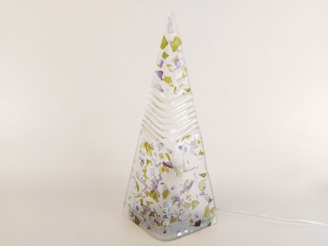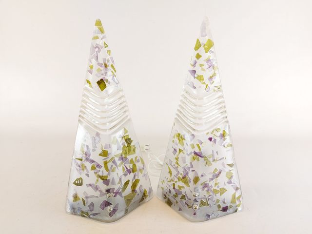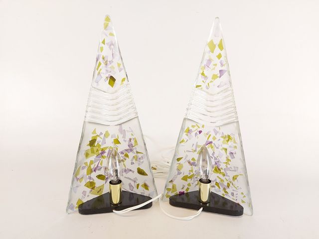 Lot # 164 - Paire de lampes triangulaire en verre avec incrustation de verre de couleur - mesurant 15 pouces SOLD