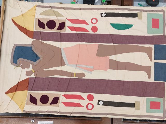Tapisserie vintage avec motifs égyptiens et mesurant 57x36 pouces - monogramme à l'arrière
