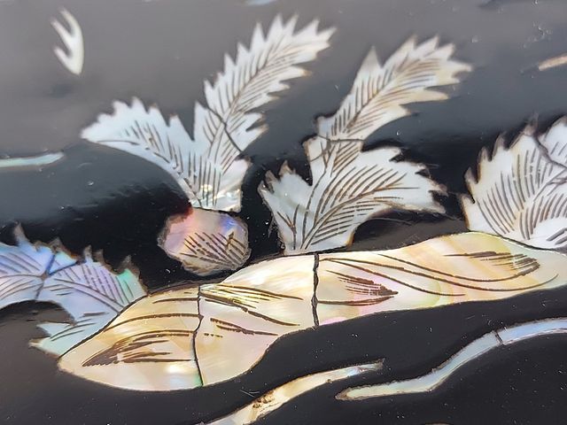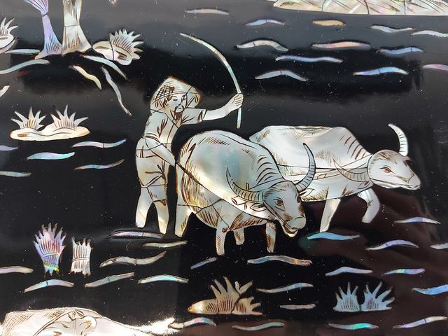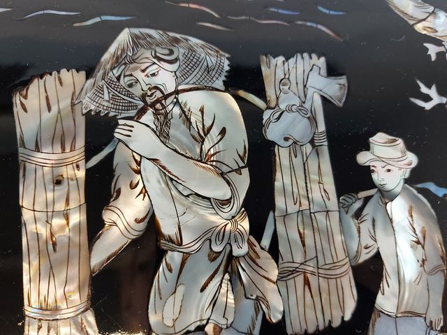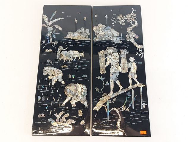 Lot # 72 - Deux panneaux orientaux laque et nacre de perles - représentant des scènes de la vie paysanne - mesurant 19x7 pouces SOLD