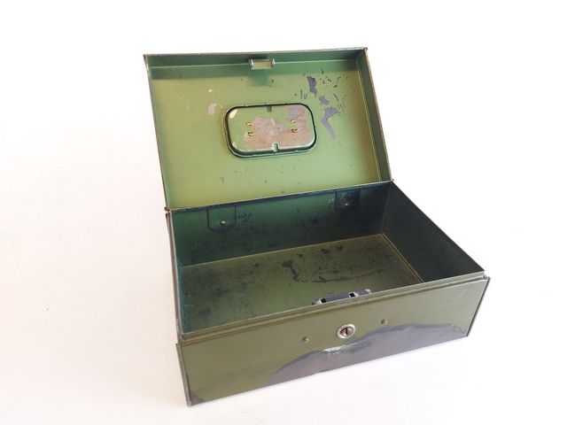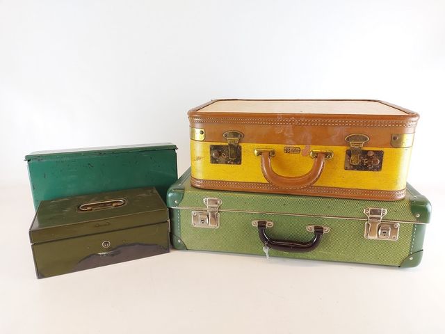 Lot # 10 - Lot de deux valises vintages ainsi que deux tiroirs à monnaie de caisse en métal dont un avec sa clef SOLD