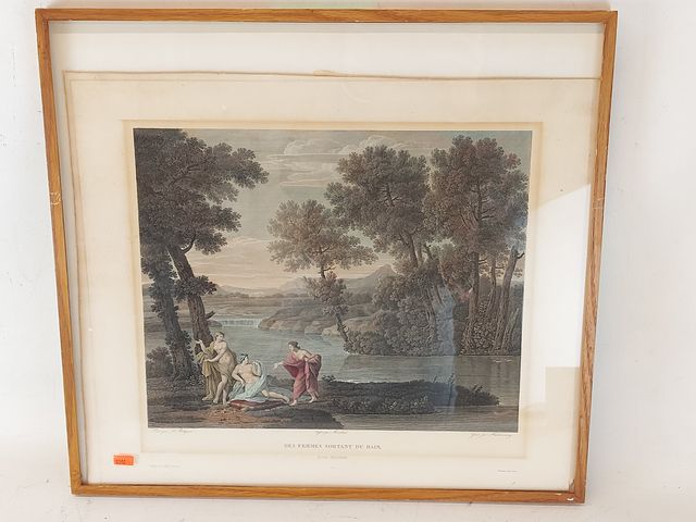 Lot # 203 - Ancienne gravure aquateintée titrée Des femmes sortant du bain - gravée par Haldenvang - mesurant 12x14 pouces SOLD