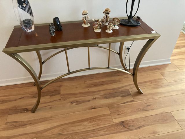 Lot # 7 - Console d'entrée en bois précieux et laiton, circa 1970, sera obligatoirement récupérée par l'acheteur à Sherbrooke samedi le 10 mai entre 11h et 16h. info: 514 835-4405 SOLD