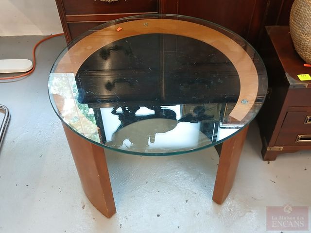 Table mid-century en teck avec dessus de verre, mesurant 16.5x24 pouces