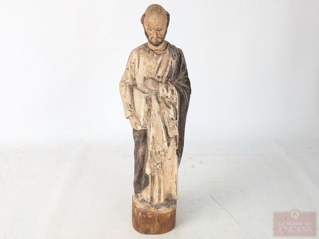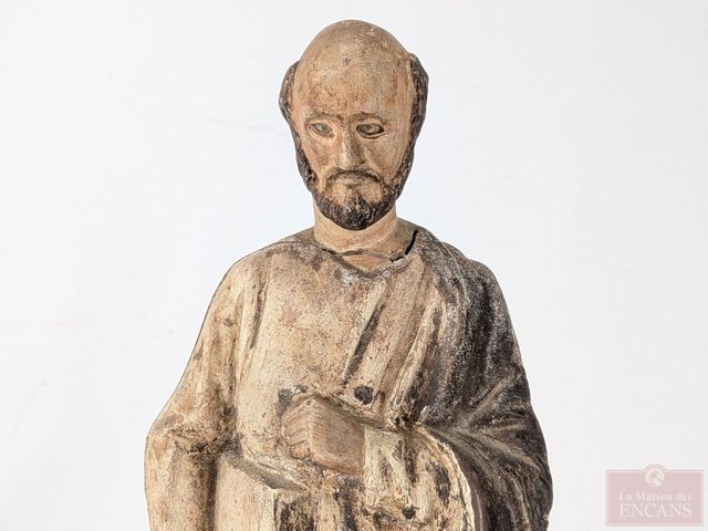 Lot # 137 - Ancienne statuette religieuse en papier mâché avec yeux en verre et base en bois, représentant un saint, datant du 19eme siècle et mesurant 13.25 pouces de hauteur