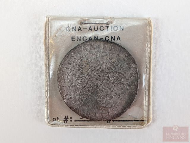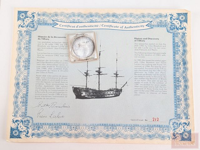Ancienne pièce espagnole en argent, provenant de l'épave du bateau Tilbury, datant de 1739 et mesurant 1.5 pouces, avec certificat