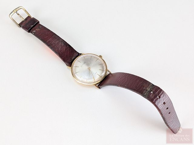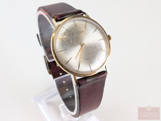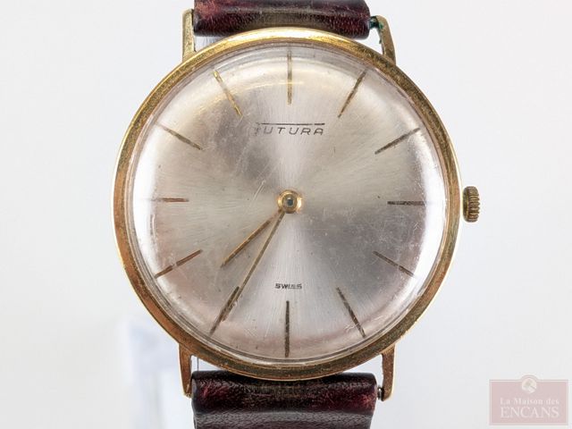 Montre Futura boitier en or 14k, fabrication suisse à remontage manuel, mesurant 35.5 millimètres avec sa couronne, fonctionnelle