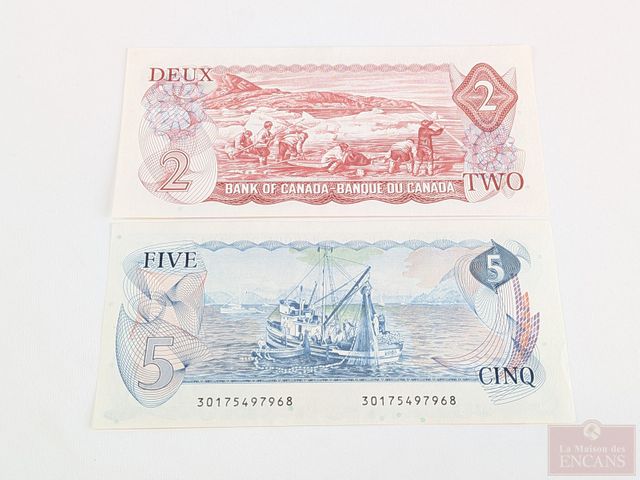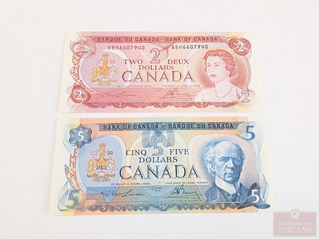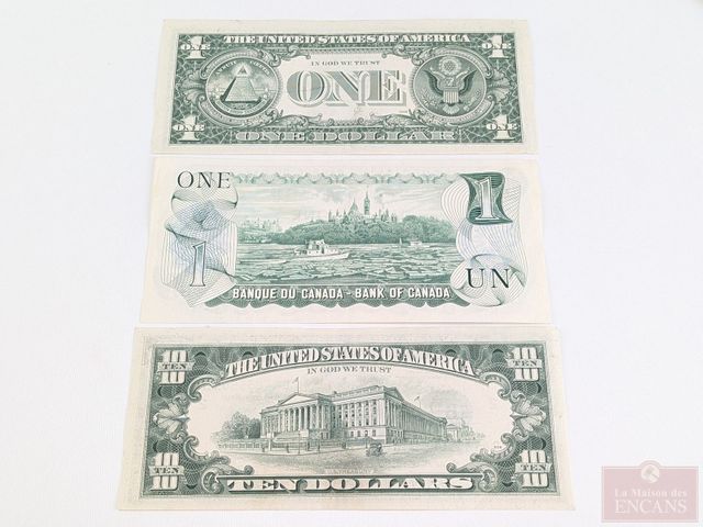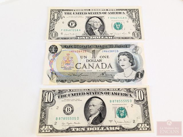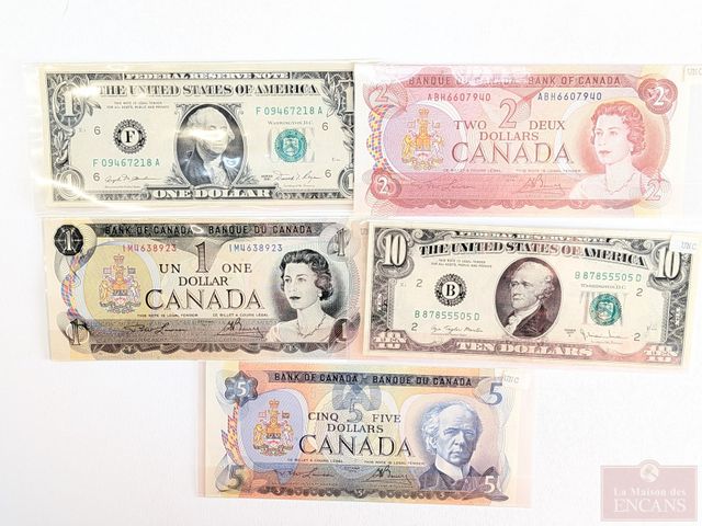 Lot de billets canadiens et américains, comprenant billets d'un dollar 1981, de dix dollars américain 1977, de dollar canadien 1972, de deux dollars canadiens 1974 et de cinq dollars 1979
