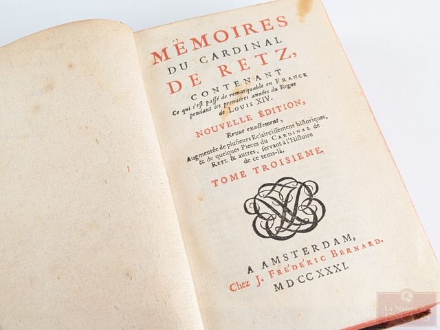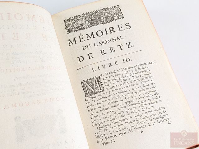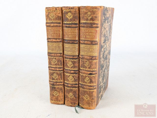 Lot # 213 - Livre ancien en trois tomes Mémoires du Cardinal de Retz, datant de 1731, comprenant multiples gravures et mesurant 6.5x4.25 pouces