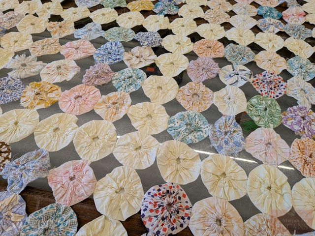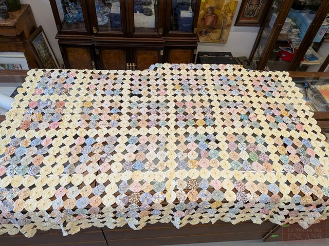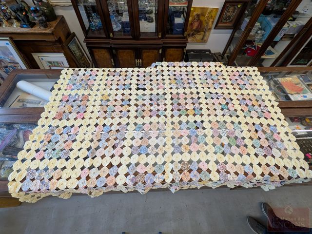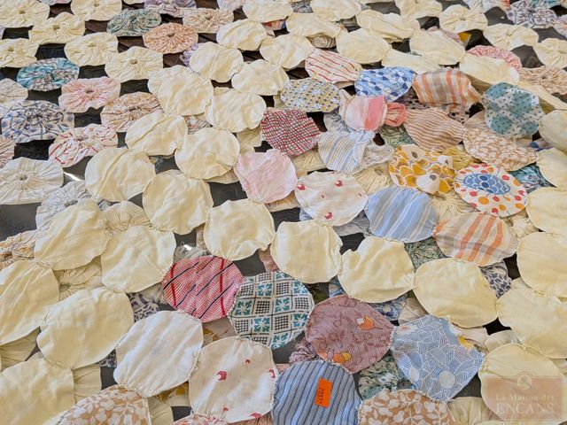 Lot # 135 - Courte-pointe québécoise artisanale à médaillions, datant du début du 20eme siècle et mesurant 75x90 pouces, en très bon état