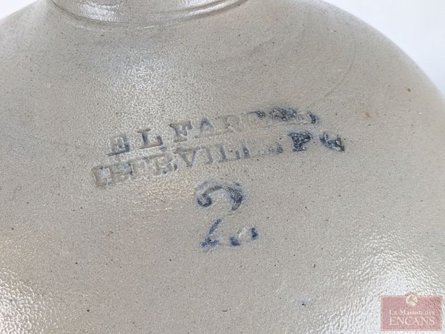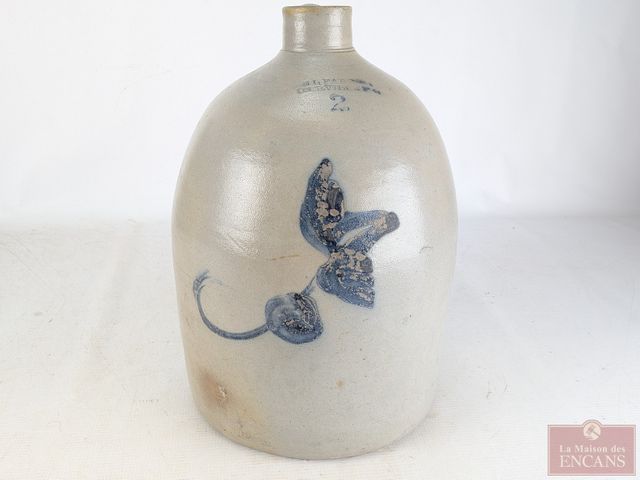 Lot # 1 - Ancienne cruche en grès Lel Farrar Iberville P.Q. deux gallons, avec fleur peinte à la main, datant du début du 20eme siècle et mesurant 14.5 pouces de hauteur