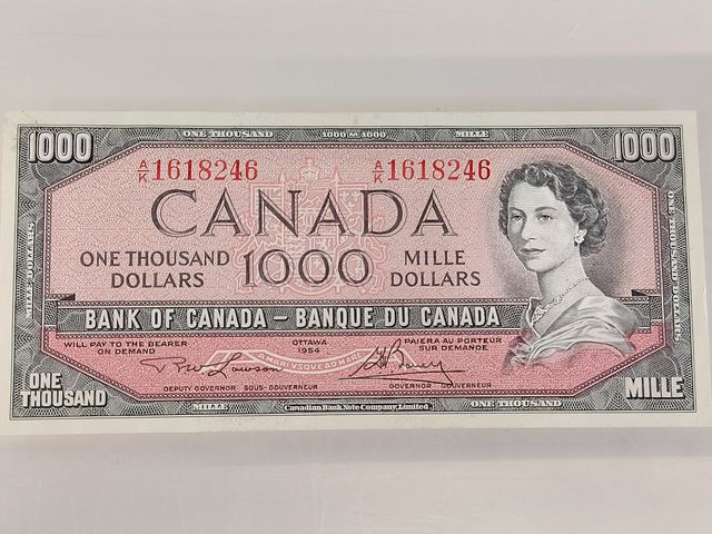 Lot # 168 - Billet de 1000 dollars canadiens de 1954 - Lawson-Bouey - en excellente condition VENDU