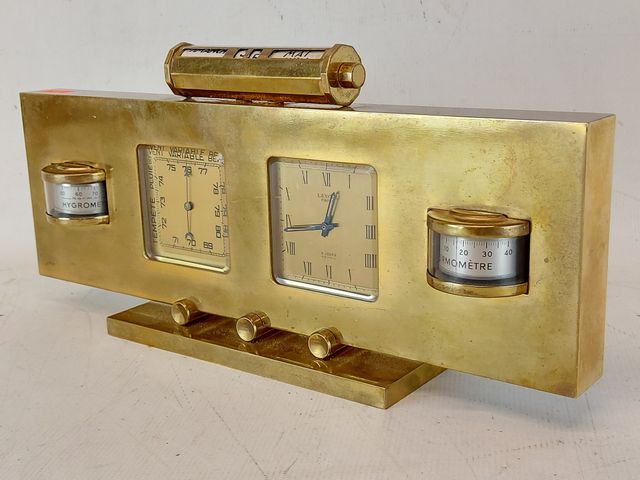Horloge à remontage manuel (huit jours) Lancel en laiton doré avec multiples cadrans dont thermomètre - hydromètre - baromètre - date - jour - heures - mesurant 13 pouces de largeur - fonctionnelle