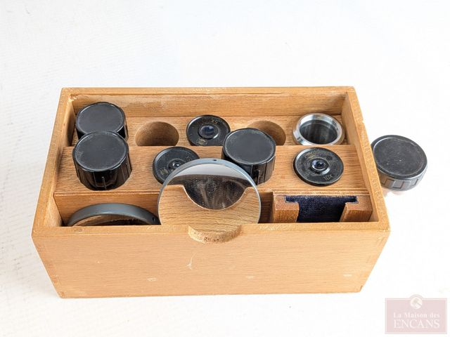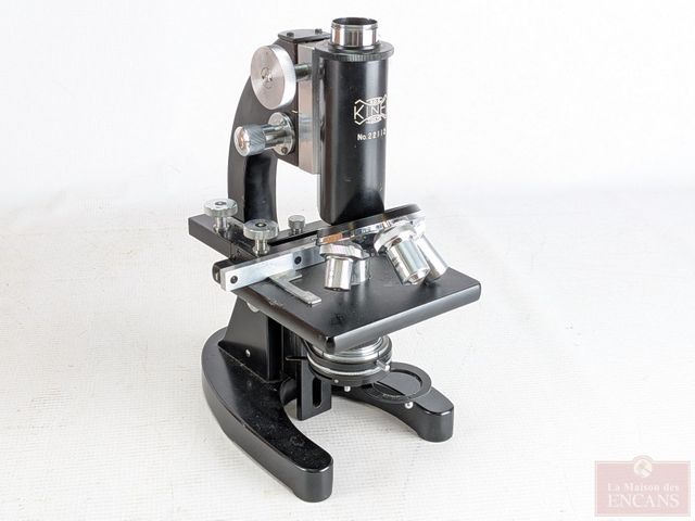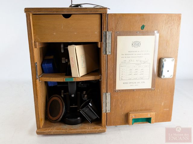 Lot # 163 - Microscope japonais Kinei, datant des années 1950, avec accessoires et sa clef dans sa valise de transport mesurant 14 pouces de hauteur SOLD