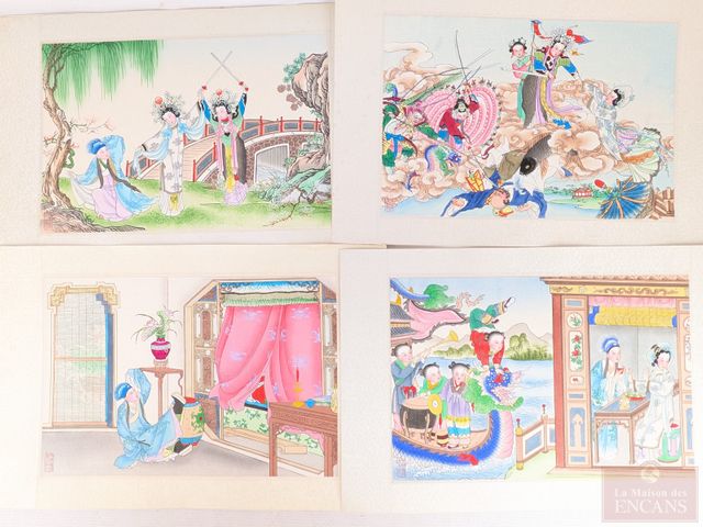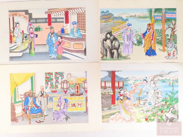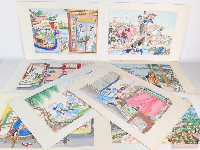 Lot # 52 - Lot de pochoirs chinois vintages, rehaussés à l'aquarelle, signés et mesurant 9.5x14 pouces chacun