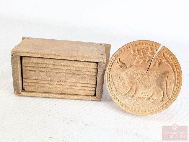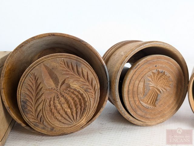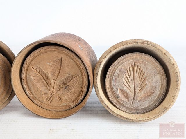 Lot # 41 - Lot d'anciens moules à beurre sculptés en bois, comprenant motifs de fleurs et de vache, le plus grand mesurant 7 pouces de hauteur SOLD