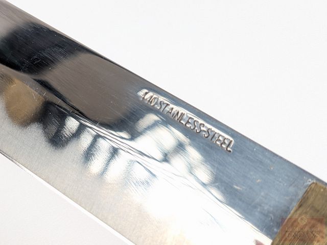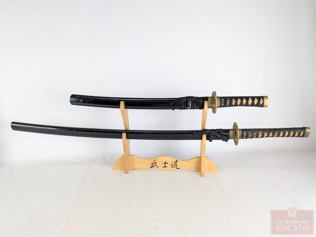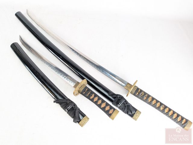 Ensemble de katanas avec lames affutées en acier inoxydable 440, le plus grand mesurant 41 pouces de longueur, sur leur support