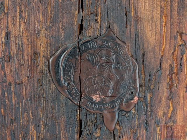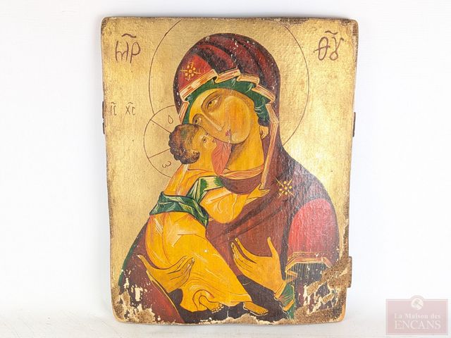 Lot # 6 - Ancienne icône orthodoxe peinte à la main sur bois, mesurant 19.75x16 pouces avec sceau à l'endos