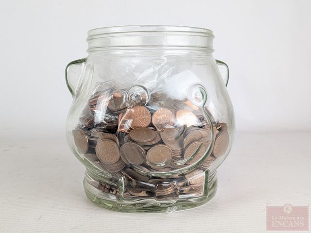 Lot # 3 - Pot à beurre d'arachide vintage Kraft en verre, contenant des sous noirs, mesurant 5.5 pouces de hauteur et pesant approximativement plus de 4 000 grammes
