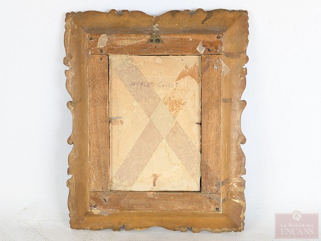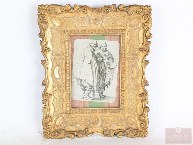 Lot # 175 - Ancienne gravure sur papier d'une œuvre de Jacques Callot, titrée Les Gueux, datant du 18eme siècle et mesurant 5x3.5 pouces, dans un joli encadrement à la feuille d'or SOLD